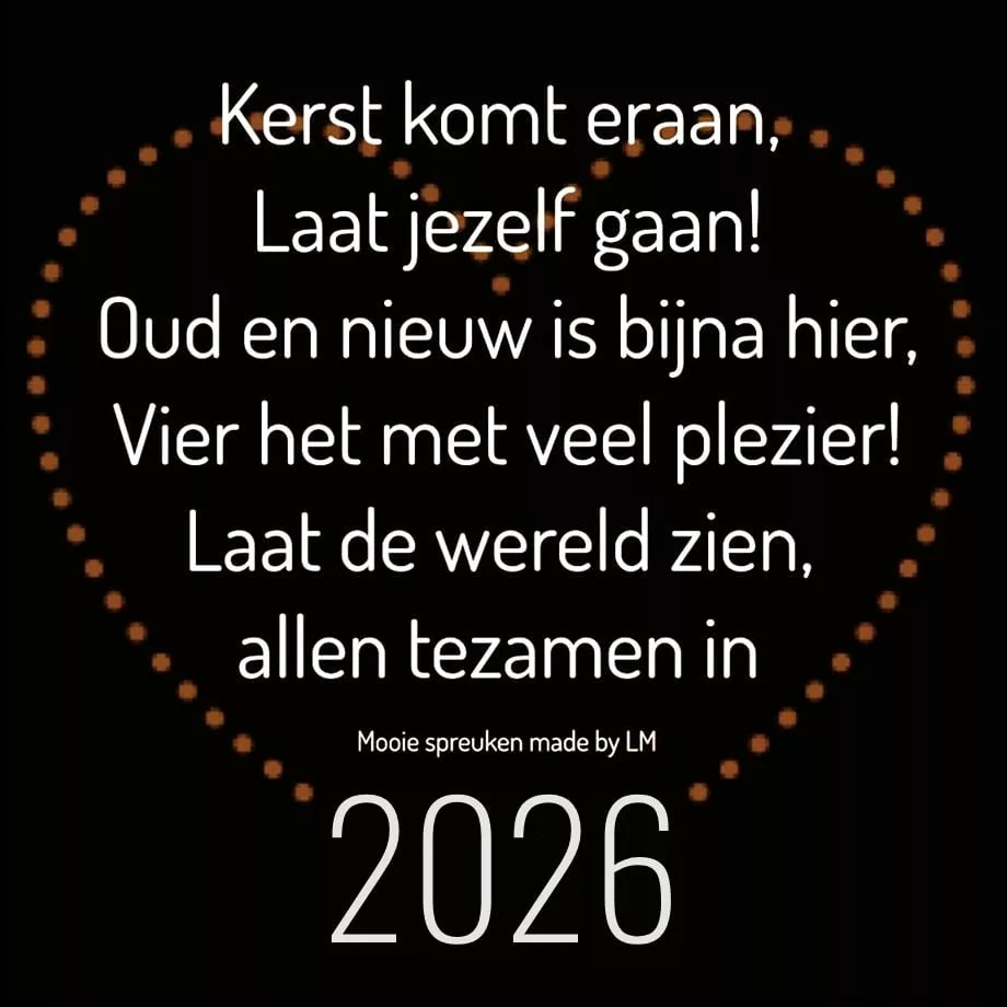 Kerst komt eraan, Laat... Kerst komt eraan, Laat jezelf gaan! Oud en nieuw is bijna hier, Vier het met veel plezier! Laat de wereld zien, allen tezamen in 2026 Link: HTML: BB code: Meer Nieuwjaar Plaatjes Vergelijkbare afbeeldingen