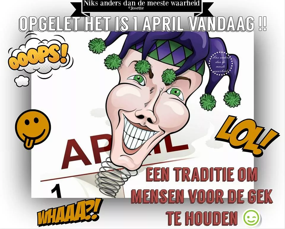 Opgelet het is 1 April... Opgelet het is 1 April Vandaag !! Een traditie om mensen voor de gek te houden. Link: HTML: BB code: Meer 1 april Plaatjes Vergelijkbare afbeeldingen